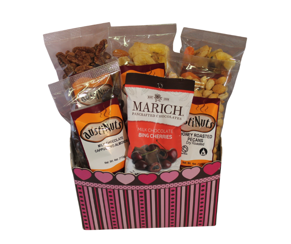 From warm cinnamon-sugar pecans and honey-kissed flavors to tropical fruit and classic trail mix, every bite feels comforting and indulgent without being overwhelming. Finished with smooth milk chocolate cappuccino almonds and decadent milk chocolate bing cherries, this sampler is a little love note in snack form.